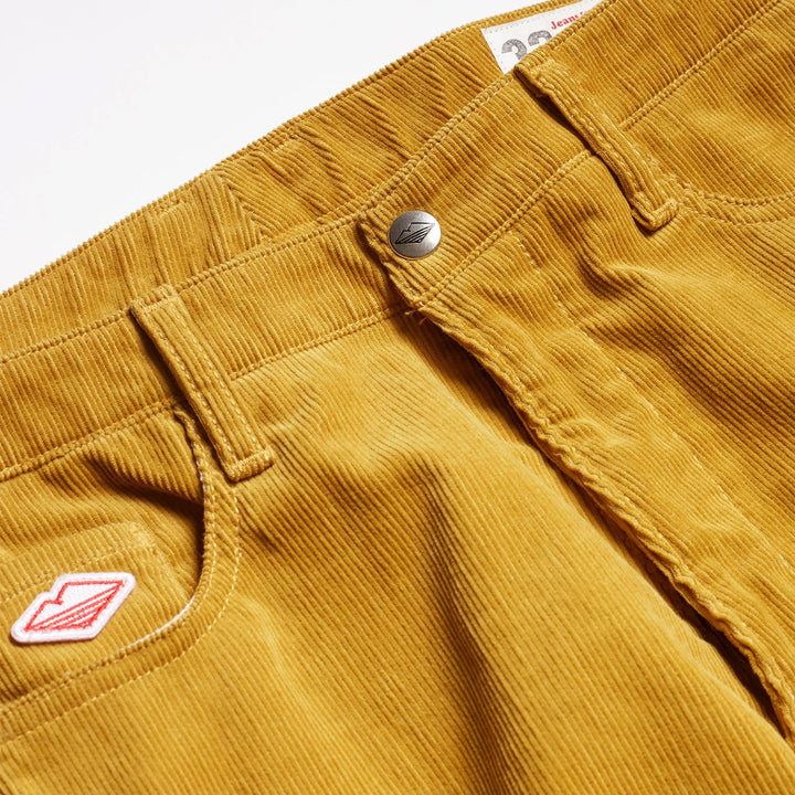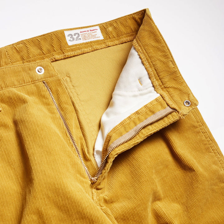 ・Collaboration with US brand Battenware ・Fusion of the essence of both companies' love for the classics ・Mustard color inspired by 70s surf style ・Japanese fine-ribbed corduroy that looks like 70s dead stock Center pleat adds a city feel to the look. ・Front dotted buttons are made by Battenware. ・Original Battenware name on the coin pocket ・Boots and shoe cut ・Made in Kojima, Kurashiki City, Okayama Prefecture ・Polished high waist ・No yoke around the waist for a sleek design ・High hip line ・Classic curved pockets and coin pocket ・70s-style Talon zippers ・All-season wearable. ・The essence of LA designer jeans